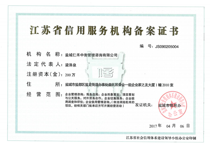 - 江蘇省信用服務機構(gòu)備案證書